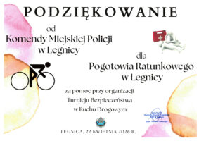 Z przyjemnością informujemy, że otrzymaliśmy podziękowania od Komendy Miejskiej Policji w Legnicy za wsparcie organizacji Turnieju Bezpieczeństwa w Ruchu Drogowym. To dla nas cenne wyróżnienie i potwierdzenie, że wspólne działania na rzecz bezpieczeństwa mają realne znaczenie.