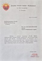 Dyrekcja Ośrodka przekazała na ręce Dyrektor Pogotowia Ratunkowego w Legnicy, dr n. med. Joanny Bronowickiej, oficjalne podziękowanie za profesjonalne przeprowadzenie zajęć i zaangażowanie pracownika naszej placówki. Jak napisano w liście: